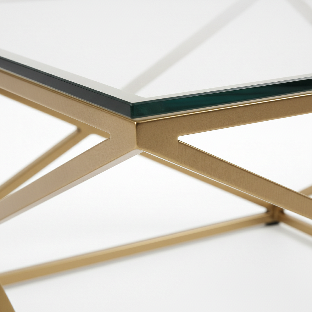 Crafted with a high-quality, 8mm tempered glass top for enhanced durability and safety, supported by a sturdy iron metal base with a brilliant, corrosion-resistant gold finish.